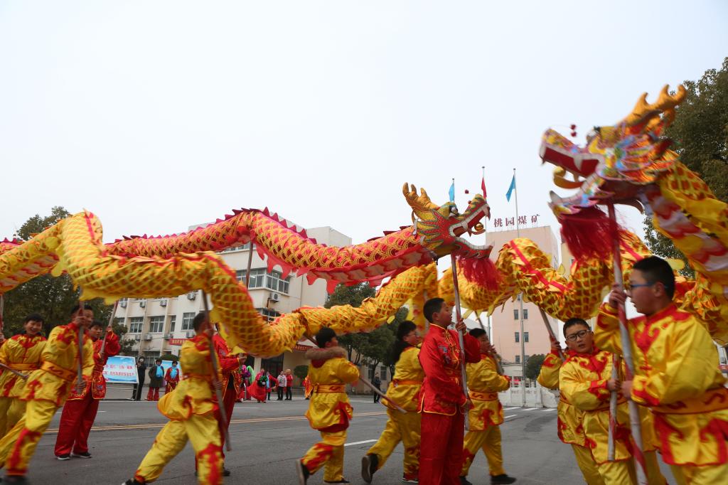 早上七点半,伴随着阵阵威风锣鼓声,两条舞龙在矿工业广场上翻腾穿梭,上下游动,象征着淮矿集团艰苦创新业,开拓争一流的企业精神,寓意着该矿干群在新的一年里,将沿着一张蓝图绘到底,撸起袖子加油干的拼搏精神。