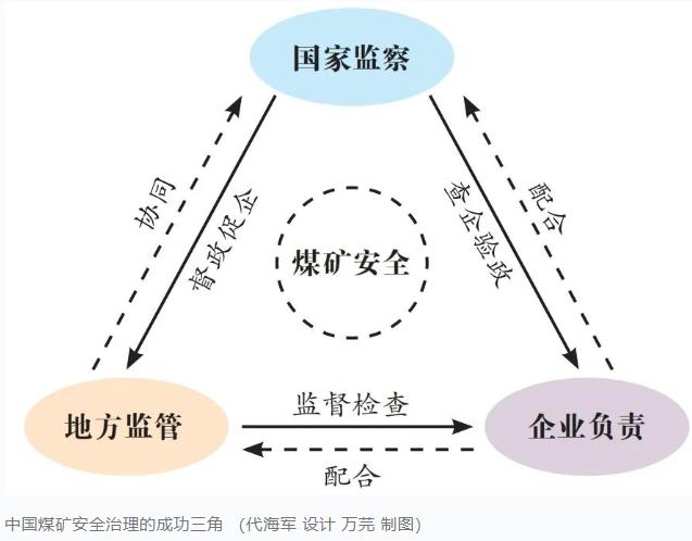 《条例》在总则中明确规定,“按照国家监察、地方监管、企业负责,强化和落实安全生产责任。”“国家监察、地方监管、企业负责”,从主体、组织、行为三个维度建构煤矿安全依法治理的框架,从制度上明晰了国家、地方、企业各方责任边界,既是对我国煤矿安全历史经验的总结凝练和创新发展,也是新时代我国煤矿安全治理法治化的基本表征,奠定了煤矿安全依法治理的基本格局。